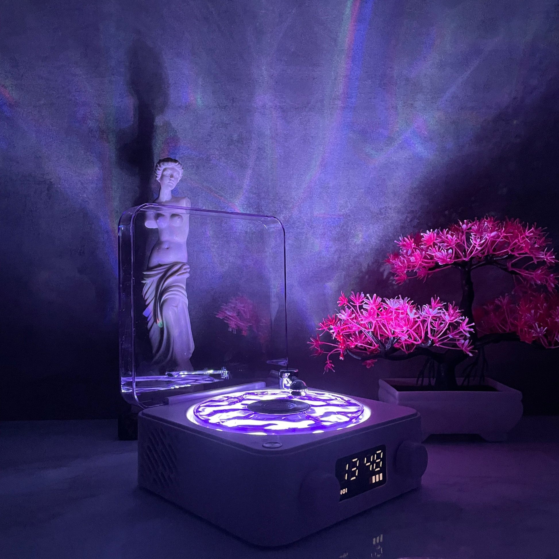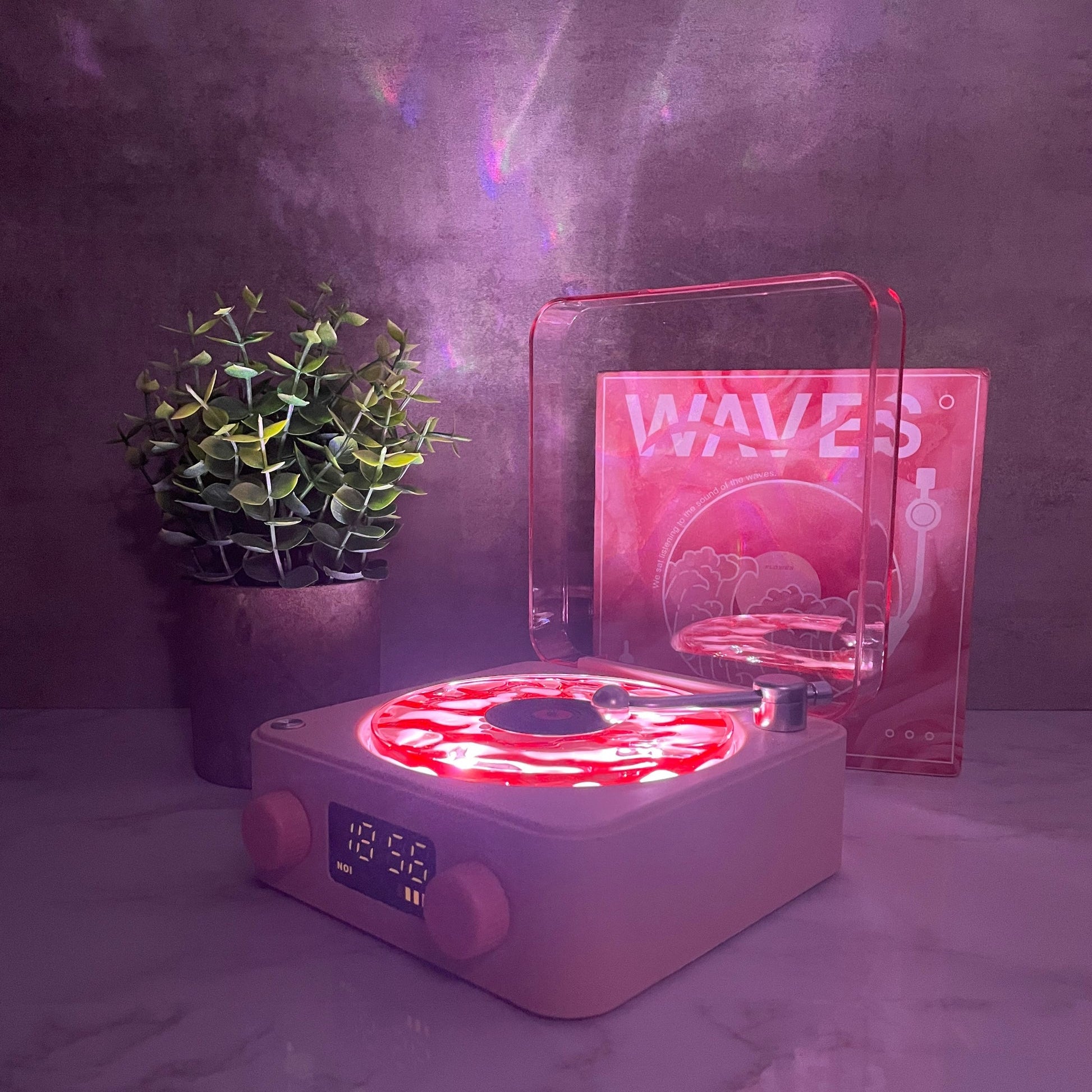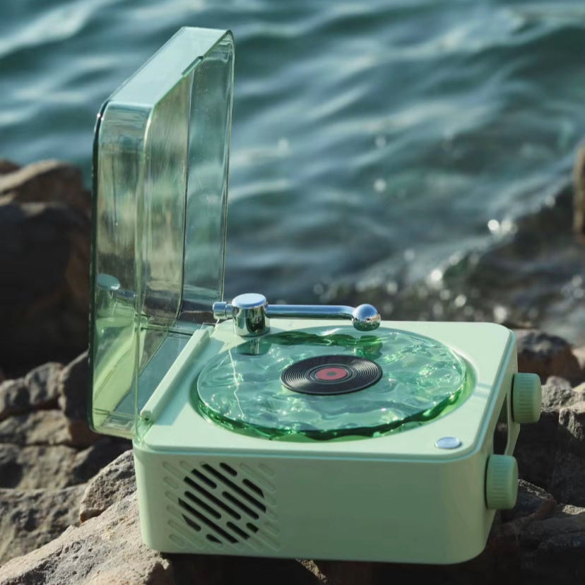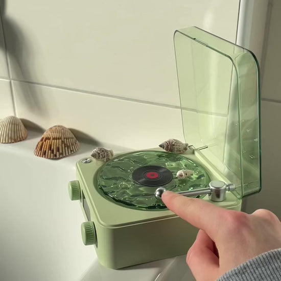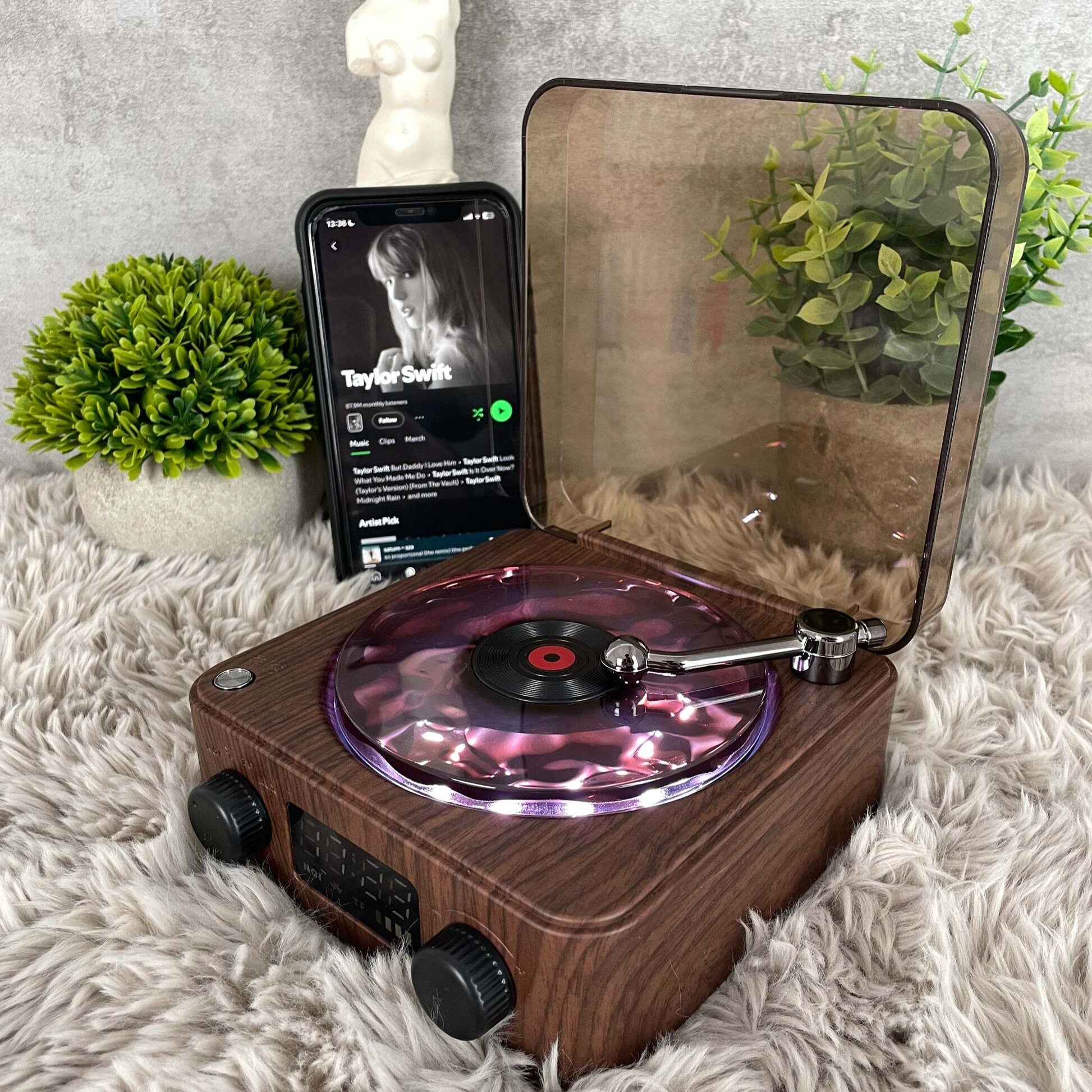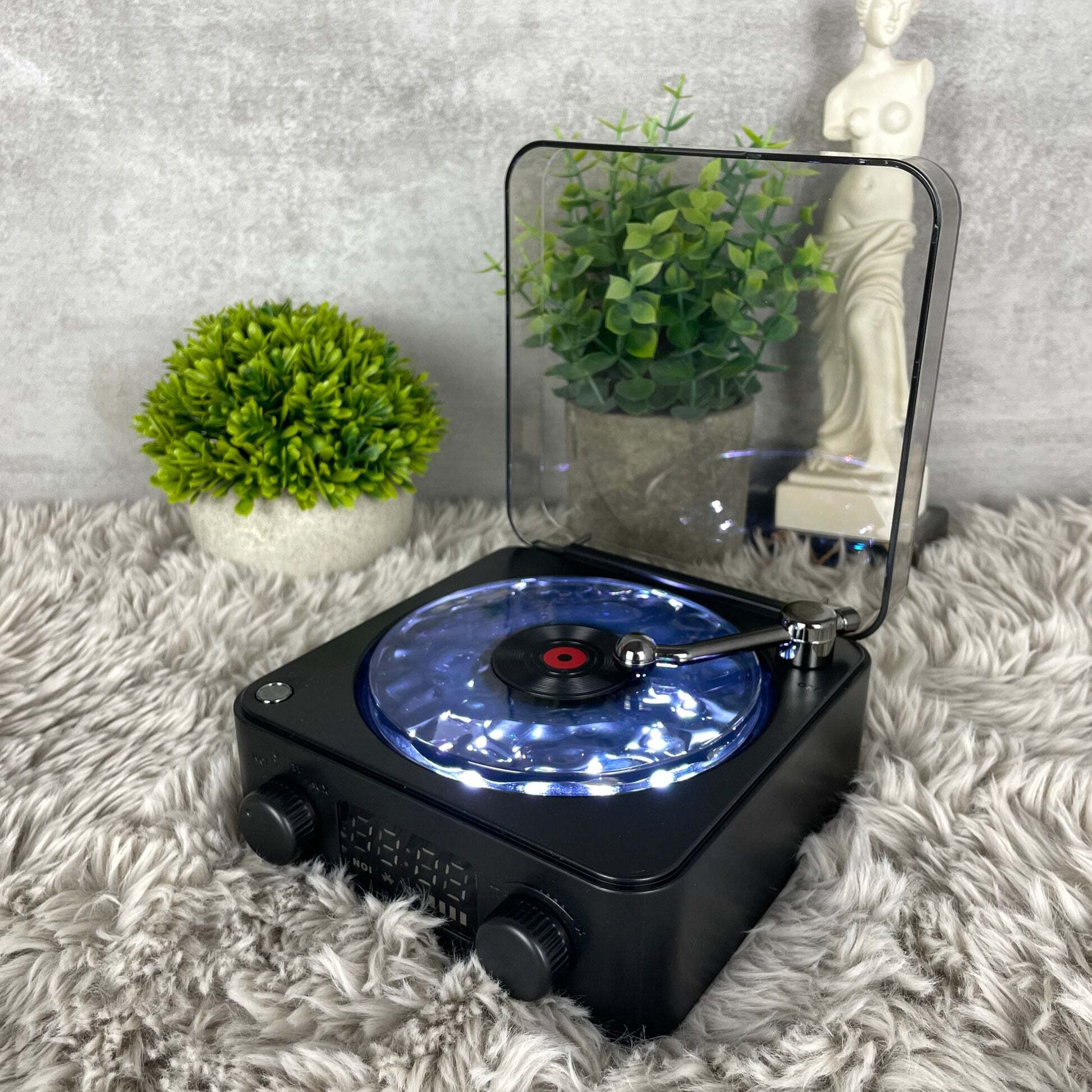 Aseta pieni levy paikalleen ja yhdistä Aurora Revontulikaiutin Bluetoothin kautta. Levysoitin alkaa pyöriä, kun musiikki soi.